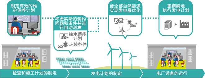 通過(guò)統一管理多個(gè)自然能源和抽水蓄能電站的發(fā)電計劃,在平衡自然能源對電力系統的影響的同時(shí),提高發(fā)電的業(yè)務(wù)的收益。 綜合考量影響自然能源的環(huán)境條件和電力需求的增減等外部情況,電廠(chǎng)的設備設施等內部情況以及發(fā)電成本等,自動(dòng)為多個(gè)電廠(chǎng)的運營(yíng)和維護同時(shí)制定計劃并進(jìn)行管理。