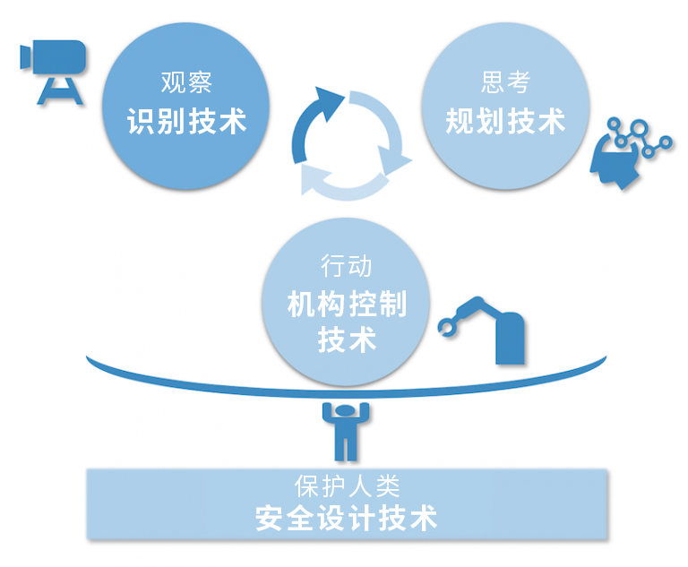 為了讓機器人勝任這種非定型作業(yè),就需要實(shí)現機器人智能化,即:觀(guān)察、思考、行動(dòng)。具體而言,“觀(guān)察”能力即“識別技術(shù)”,“思考”能力即“規劃技術(shù)”,“行動(dòng)”能力即“機構控制技術(shù)”。