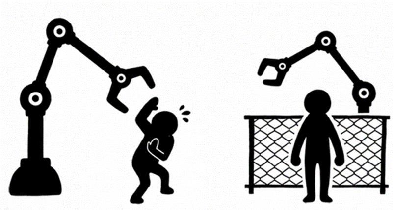 由于人類(lèi)與機器人的距離變近,出現事故的風(fēng)險增高。為確保安全性,需要將機器人與人類(lèi)的作業(yè)區域分開(kāi),并進(jìn)行全面管理。