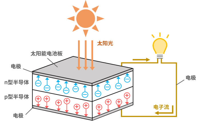 太陽(yáng)能電池由兩種半導體(即:n型半導體和p型半導體)粘合而成,兩種半導體之間使用通電導線(xiàn)連接。當太陽(yáng)光照射到太陽(yáng)能電池板時(shí),n型半導體聚集負電荷(電子),p型半導體聚集正電荷,而當負電荷的電子流經(jīng)導線(xiàn)時(shí),電力便產(chǎn)生了。LED(發(fā)光二極管)就是利用這種逆向發(fā)電原理。