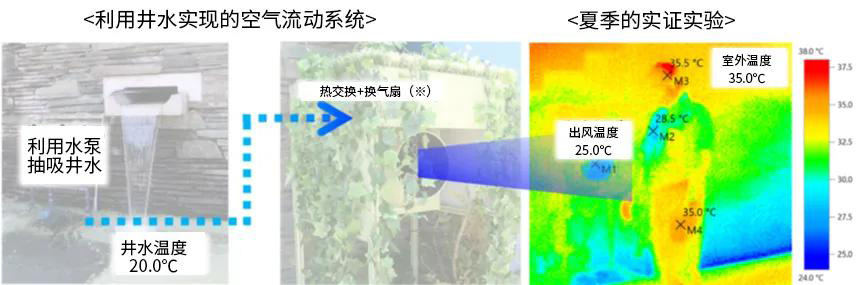 ※空調通常使用氟利昂之類(lèi)的制冷劑,但本實(shí)驗使用的是清涼井水,通過(guò)抽吸井水,并使用換氣扇傳送涼風(fēng)。