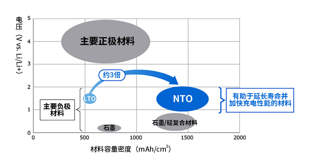 即使SCiB?得到了較好的發(fā)展,東芝也未曾停止對負極材料的探索。東芝目前正在研究將鈮鈦基氧化物(NTO)用作下一代負極材料。在兼具LTO壽命長(cháng)和充電快的優(yōu)點(diǎn)同時(shí),NTO的理論容量密度約為L(cháng)TO的3倍。